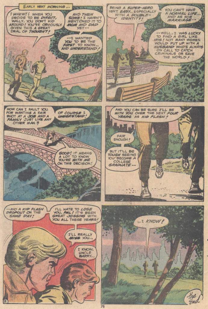 After that, all that’s left is a short two-page epilogue illustrated by Irv Novick in which we see Wally’s graduation, and he lays down some bad news on Barry. Wally wants to live an ordinary life, and so while he’s still going to be attending college, once that’s done, he plans to quit being Kid Flash and retire as a super hero. Barry understands his protege’s desire for normalcy and is supportive of this decision. It’s a bit of an odd beat in retrospect, in that in later years Wally would very much be defined as somebody who loved his powers and being a hero more than anything. But this characterization did continue on into the future into NEW TEEN TITANS when that series began.