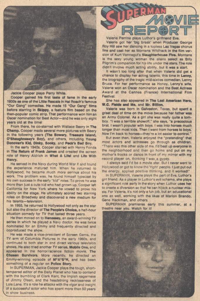 This issue also included a two-page feature listing the various members of the Flash’s Rogues’ Gallery written by assistant editor Bob Rozakis, and another report on the in-production Superman film. As before, these grainy photographs of Jackie Cooper and Valerie Perrine did nothing to raise my level of excitement for the movie. They were a nice resume of the stars’ previous accomplishments, but those were all roles that came before me, and I wasn’t in the slightest interested at the time.