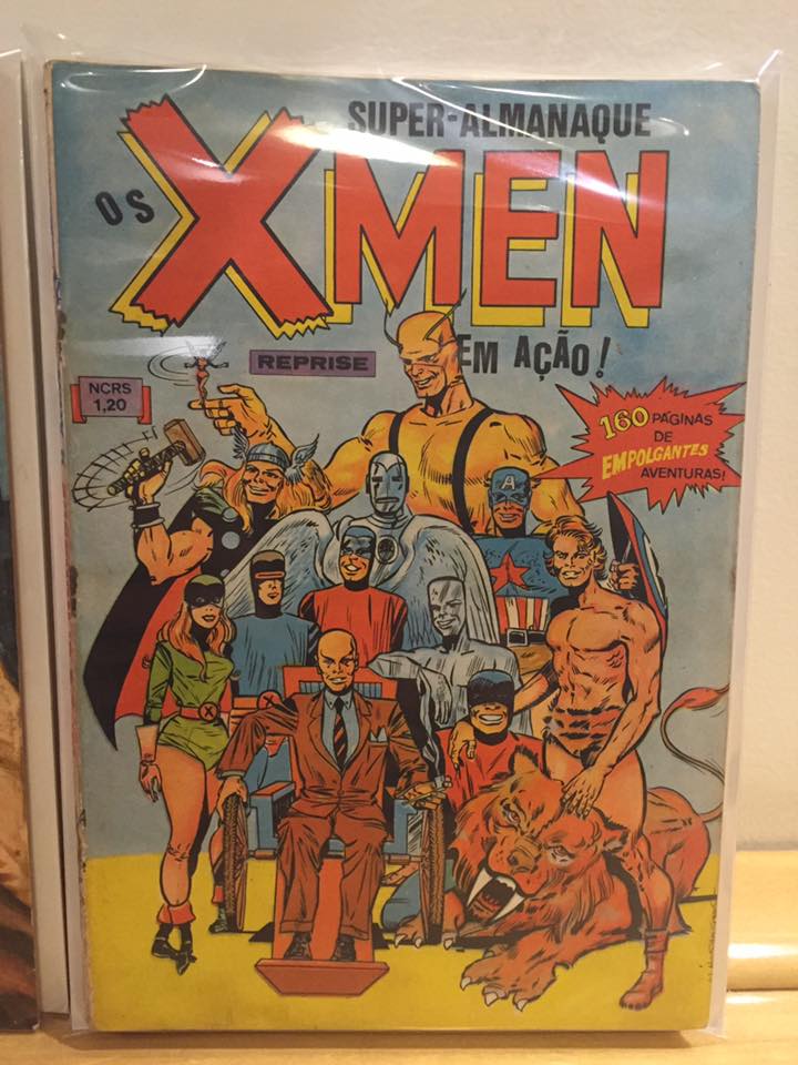 There are also some great color choices on this home-grown Brazilian cover for an X-MEN reprint. The X-Men themselves have been colored with the color schemes of their later individual costumes, and the Avengers are just made up whole cloth–leading to an Iron Man colored like iron and a weird orange Giant-Man. I like the fact that Thor is twirling his hammer and Giant-Man seems to be mocking him by twirling the Wasp in the exact same way.