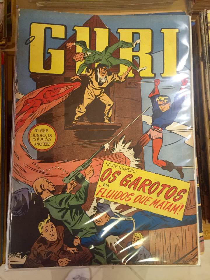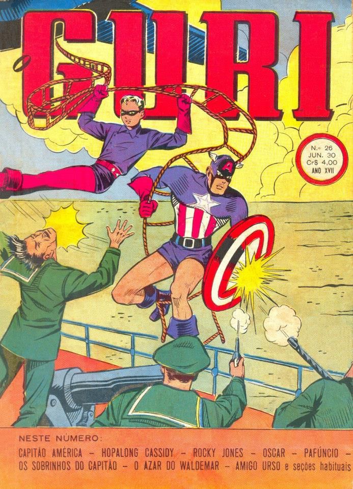 The Brazilian comics magazine Guri published work by a number of golden age publishers during the 1940s, all mixed and matched, including a bunch of Timely stuff. This particular cover, featuring the Young Allies, is noteworthy to me because the miscoloring makes it seem as though Bucky has lost his pants.