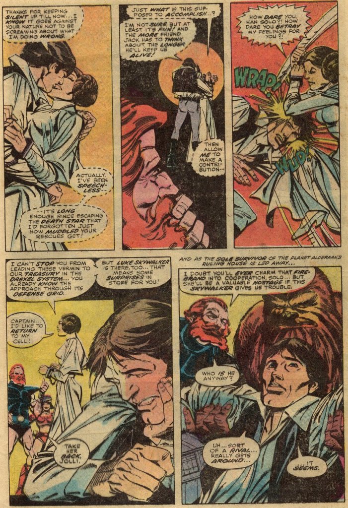 Consequently, this issue feels a bit too familiar somehow. It opens with Han Solo and Chewbacca being captured by a Star Destroyer helmed by an old pirate associate of theirs, Crimson Jack. By a total fluke, Jack and his cohorts (in particularly the beret-wearing Jolli) have also captured Princess Leia when she ventured out in search of the missing Luke Skywalker, and they intend to hold her for ransom–if they can get her to divulge the location of the Rebel Base in order to make their demands. Outgunned, Han is forced to be smooth and sneaky, picking up on cues that Leia gives him to divert Crimson Jack and company to the Drexel System, where Luke went missing. They’ve become an unknowing rescue party.
