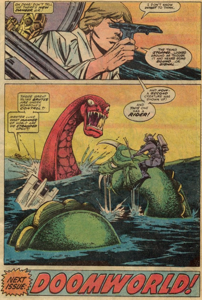 Meanwhile, we find Luke, Artoo-Detoo and See-Threepio on Drexel, having crashed their ship into the serpent-filled seas. The three heroes are able to fend off an attack by a giant serpent, but they’re all still stuck on a sinking ship with no land in sight. But the issue wraps up with a new wrinkle, as Luke spies a second serpent in the distance–this one bearing a rider upon its back. Is this friend or foe? We’d need to wait a month in order to find out, as this is where things become To Be Continued! I never became especially enamored of the STAR WARS comic book, though I wound up reading a great number of them–I had friends for whom this was really about the only comic they would follow. It was STAR WARS, you know?