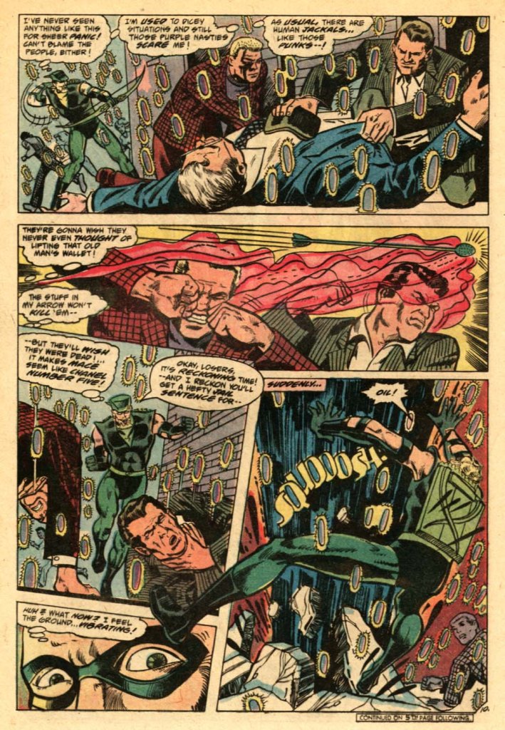 Green Arrow heads out to Drok’s headquarters, where he finds a protest in place against the impending experiment. Ollie finds Air-Wave among the protesters–he thought it might be instructive to attend a protest march. Inside the building, despite the warnings of some of his fellows, Drok insists on going ahead with his plans. He activates his device, which will pull quarks up to the surface from the magma layer of the planet, quarks that he believes will contain enough energy to solve the nation’s energy crisis. But when he does activate the machine, the entire area is bombarded by strange purple capsules. They appear to be harmless, but their eruption causes panic both inside the building and out. Green Arrow sends Air-Wave into the building to find the source of the difficulty while he remains outside to quell the panic-stricken protesters as well as some opportunistic pickpockets.