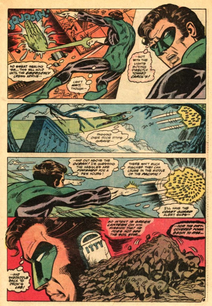 The issue opens with another character carried over from a different writer: Air-Wave. I liked Air-Wave. He was a super hero in training, the young cousin of Hal Jordan who shared a name with him, and the son of the golden age Air-Wave, Larry Jordan. He was trying to use his father’s equipment to get into the super hero game, but he was both young and inexperienced, so Green lantern arranged for his buddy Green Arrow to give the kid some training. Leaving Air-Wave to practice out back, Green Arrow goes into the house to join Hal and Dinah, where it is confirmed that, for no particular reason, Hal’s little pal Itty has perished. There’s no cause of death that Hal can determine, so everybody assumes that it must be natural causes and the decide to bury him. They do so in a full-size grave, which seems like a bit of overcompensation when burying a critter no larger than a finger, but whatever.