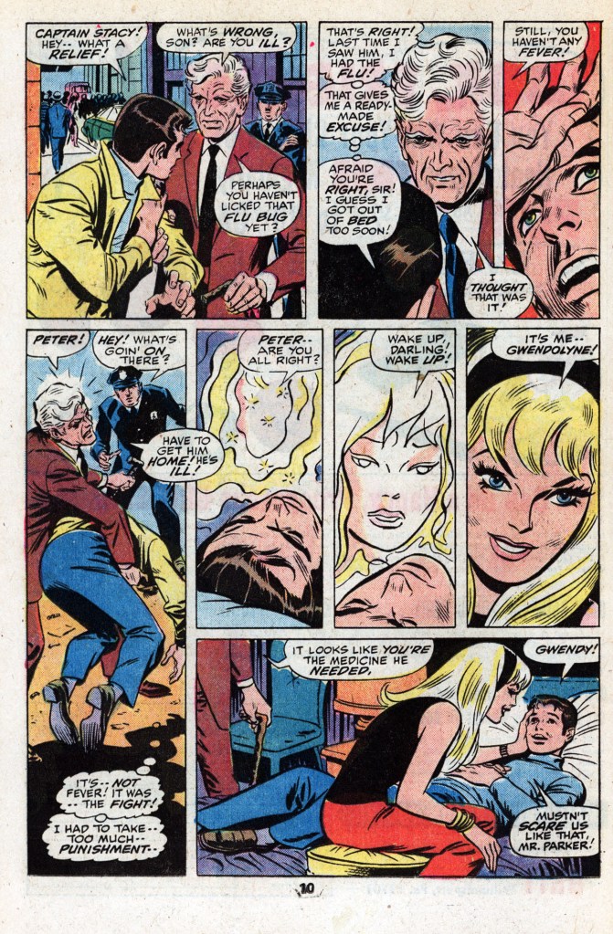 But Peter is on his last legs from the beating he just took at Ock’s hands, and so just moments after he bumps into retired police captain George Stacy, the father of his romantic interest Gwen Stacy, he collapses, out on his feet. He awakens to find himself at the Stacy home, being ministered to by Gwen. I have to say, it was stories such as this one that made me really like Gwen–especially since I didn’t really care for the present day Mary Jane Watson, who always struck me as being shrill. Even if it was just based on her Romita-given good looks, I could see what Peter saw in Gwen. I don’t know that I knew that she had been killed off when I first read this story, but it was clear that she was no longer around for some reason in the present.