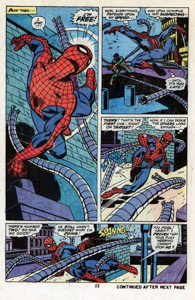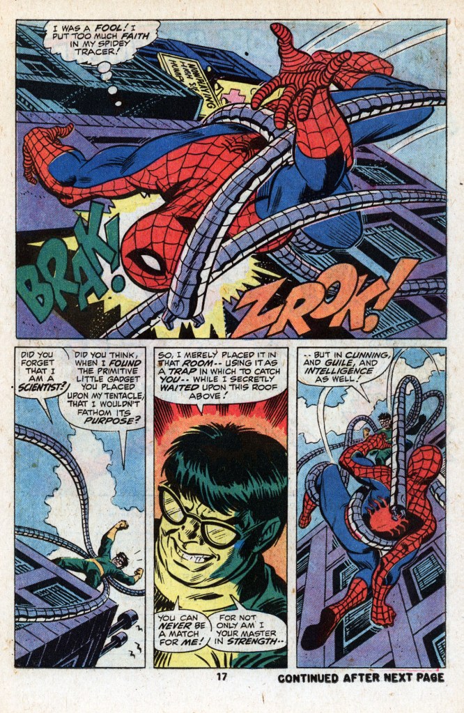 And so the fight kicks off, in electric Gil Kane style. At one point, Ock grabs Spidey, pinning him to a wall with two of his tentacles while the other two pummel the web-slinger. Spidey is desperate to free his arms so that he can use the special webbing triggered by his belt-trigger, and he pulls out all the stops to extricate himself from Ock’s grasp, in a short sequence clearly inspired by Ditko’s Master Planner saga. From there, Spidey begins to zap Ock’s tentacles with his new web formula. It’a a concoction that messes up the mental connection between Ock and his arms, which begin to flail wildly. They wind out cold-cocking Ock himself–but they also wind up swinging around and demolishing a nearby smokestack, sending a hail of dangerous bricks and masonry careening to the ground below. Way to go, Spidey!
