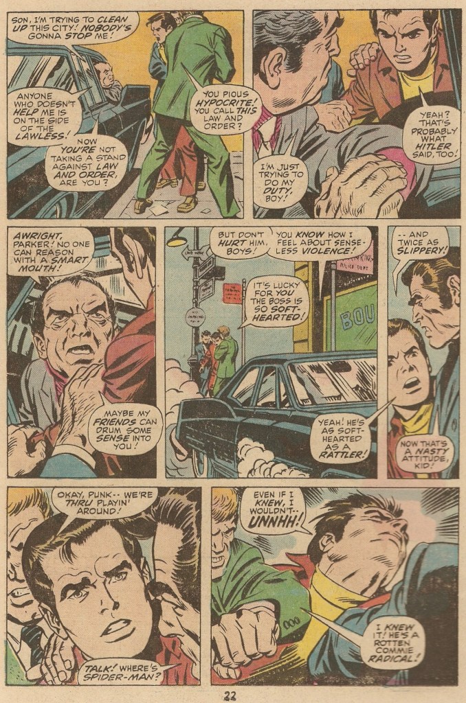 What’s on full display in this issue is the soap opera, which is strong enough to carry things along. Because Spider-Man was seemingly responsible for her father’s death, Gwen Stacy, Peter’s girlfriend, is determined to help to bring the web-slinger to justice. In order to do so, she offers her help to Sam Bullit, a former cop her Dad kicked off the force for excessive violence who is running on a Law and Order ticket. The oration that Bullit gives on this page feels like it could have been ripped from the headlines today–even now, some 50 or so years after this adventure was first penned, there are still politicians who are saying pretty much these same things.