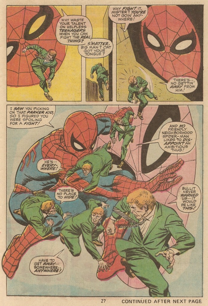And Bullit’s campaign is working. All across the city, people are terrified of Spider-Man–a fact that, typically, begins to get Peter Parker doubting himself and whether he’s as much of a menace as he’s painted to be. And Peter’s fortunes take a turn for the worse when he’s approached by Bullit and a few of his goons on the street. Knowing that Parker takes pictures of Spider-Man, Bullit assumes that he can turn them on to the wall-crawler’s whereabouts. And when Peter tells them to go climb a rope, Bullit himself takes off so that his men can beat the hell out of Parker trying to make him give up Spidey’s location. As is typical, Peter can take teh beating thanks to his spider-strength, but he feels like he can’t fight back without disclosing his true identity. This seems a bit simplistic and binary a situation to me, but then I haven’t ever had to worry about concealing a secret identity. Eventually, Bullit’s guys get tired and leave Peter sprawled in the alley–and as soon as they head out, he leaps up, changes to Spider-Man, and the hunted becomes the hunter.
