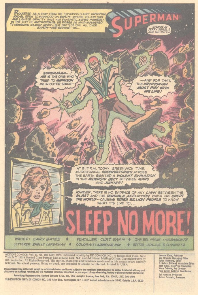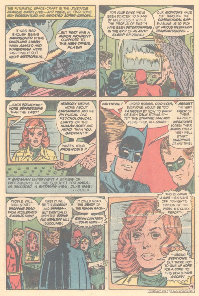 In order to get the better of Amazo last time, Superman and company (Lois Lane and Amazo’s creator Professor Ivo) inadvertently jumped forward five or six days in time, to a point where the Krypton radiation no longer debilitated Superman. But now we learn that during that time, a new malady has overtaken the human race. It’s an awakeness plague, and so everybody on Earth had discovered that they can no longer sleep. Which sounds like a good deal at first, but after five days with no rest, everybody’s minds and bodies are at the breaking point, with no hope for a cure in sight. The Justice League members have been trapped all this time in another dimension, where Amazo imprisoned then and their satellite headquarters at the beginning of this adventure. So Superman is still on his own.