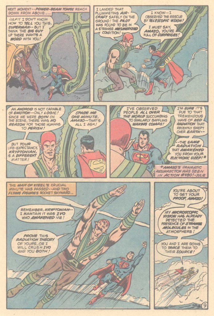 Dropping Lois and Professor Ivo off at WGBS, Superman heads out into Metropolis to try to seek out the cause of the crisis. Along the way, he comes across a series of near-accidents caused by drivers and pilots being too sleep-deprived to safely operate their equipment. He’s also attacked by Amazo–but the Android ends up actually assisting the Man of Steel in saving lives. Amazo has no grudge against any of these people–it’s only Superman that he wants to destroy, for protecting Professor Ivo from Amazo. The android is convinced that Ivo is responsible for summoning him back from the blessed oblivion in which he’d been kept, but Superman thinks that the Krypton radiation is what reactivated Amazo, and he believes it is also connected to the sleeplessness plague. He convinces Amazo to join him in his efforts to get to the bottom of things.