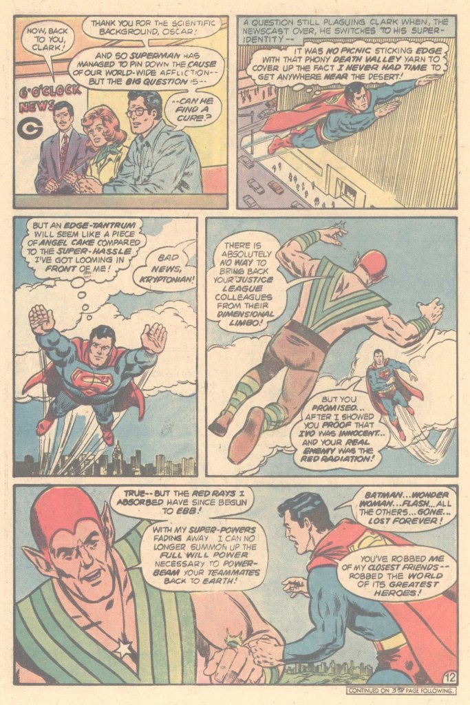 Superman does take the time out of his busy schedule to drop in on WGBS as Clark Kent to preserve his secret identity, and as a means of getting the truth of what he’s discovered to the rest of the world. As is reported on the WGBS News that evening, while the Krypton radiation itself was harmless to human beings on Earth, the plant life absorbed it, photosynthesizing it into a gas that is causing the sleeplessness problem across the world. His secret I.D. secure for the moment (and what kind of a goon is Superman to be worrying about that while billions of people are suffering from the sleeplessness?) Kent becomes the Man of Tomorrow again and rendezvous with Amazo. The android tells him, however, that he cannot free the Justice League from their interdimensional prison. The res sun radiation that awakened him is wearing off, and so he cannot summon up sufficient will power for his power ring to reverse the process.