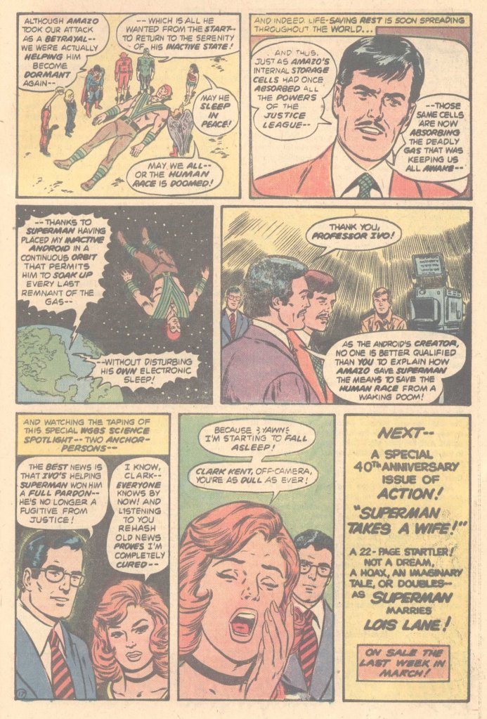 And finally, with Amazo’s android body inert once more, Superman and Professor Ivo are able to reconfigure its absorption properties to soak up all of the gas in the atmosphere that is keeping everybody awake. And with that simple bit of mop-up, the adventure is concluded and everybody can get a good night’s sleep again.