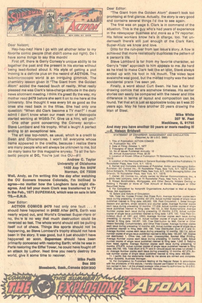 The letters page for this issue of ACTION COMICS also included that year’s Statement of Ownership. From it, we can learn that the series had been selling 180,132 copies out of a print run of 465,982, giving the title an efficiency of 38 1/2%, which is about par for the course in this era. That’s not a bad number of copies being sold, but with a print run that high, you’re still needing to sprint close to three copies in order to sell one, and then have the remainder shipped again and destroyed. A wasteful process all around.