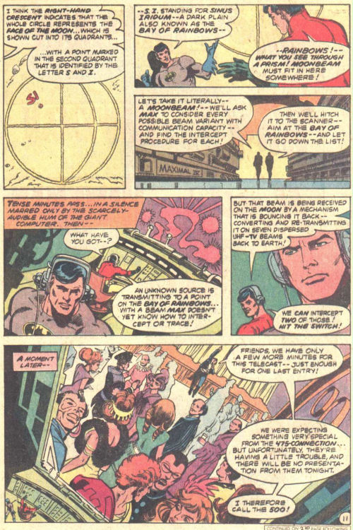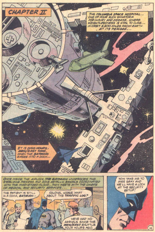 The clue turns out to be a broadcasat beam that’s being bounced off of the moon. Watching the playback, Batman and Robin learn that it’s from a conglomerate of wealthy citizens who indulge in competitive nostalgia, displaying the rare and collectible items they possess in competition with one another. Not something to kill anybody over, but clearly the guy Dick ran into wanted the antique car for his own entry. Batman moves to follow up on this lead, but before the pair can take off, a very old Alfred enters with a meal, and to tell Robin that his wife and twin children will be staying over at the old Wayne Manor. From there, Batman journeys to Columbia Space Hospital in an attempt to get more information out of the stricken Meg/East Cop.