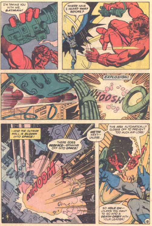 The issue opens with a lot of world-building. While no year is given, we are in the future, at a time where Gotham City has been absorbed into Megalopolis-East, which spans the territory from Boston down the East Coast to Washington DC in the manner of Judge Dredd’s Mega-City One. Both Batman and Robin are still active as crime-fighters, although Robin has gone on to his own solo career and own accomplishments as Dick Grayson (and is wearing the uniform Neal Adams designed several years earlier and which was presently being sported by the Robin of Earth-2.) As we open, there is an attack on the Greater Gotham International Airport’s biweekly shuttle launch, but the attackers are intercepted by Batman.