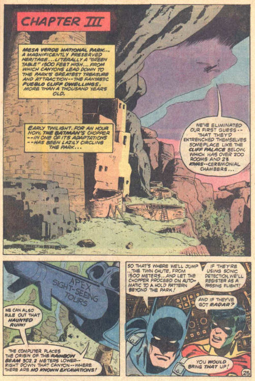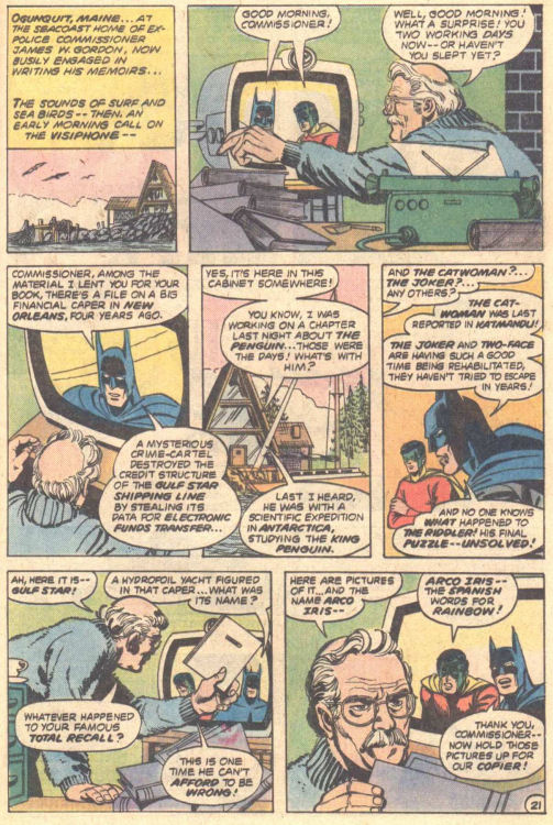 Hunting down leads, Batman and Robin contact former Commissioner Gordon, who has now retired to Maine and is writing his memoirs. In this brief scene, we learn that the Penguin is on a scientific expedition to the Antarctic, Catwoman was last seen in Katmandu, the Joker and Two-Face are being rehabilitated, and the Riddler disappeared, never to be seen again. Batman and Robin use the information that Gorgon gives them to hone in on their target, the Rainbow organization. But this is all done with them standing in the Batcave and reasoning, and using high-tech hardware. It’s pretty unexciting. In the end, Batman has a location, and Robin refuses to be left behind again–so the Dynamic Duo sets out together.