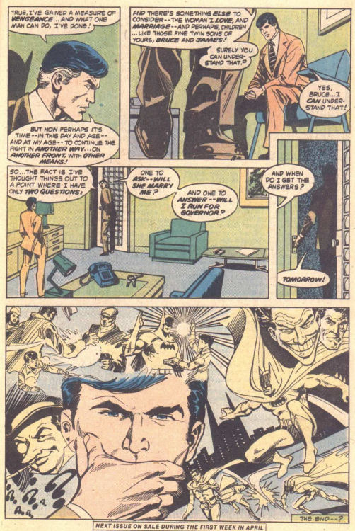 Well, in a two-page epilogue, Bruce tells Dick that he’s thinking about retiring. A consortium has approached him about running for Governor, and he’s considering it. He’s tired of the fight, and envious of the family that Dick has built for himself. Bruce also mentions a woman he loves–a woman that we have seen nowhere in this story and who isn’t so much as given a name (presumably to keep from locking anything in on Batman’s future.) And so he’s thinking about hanging up the cape and cowl and going into politics instead. And that’s where the story ends, with Dick contemplating the career of the Batman. So it’s nothing more catastrophic than ennui that brings the career of the Masked Manhunter to a close, in what has to be one of the most anti-climactic moments in Batman history. THE DARK KNIGHT RETURNS this was not.