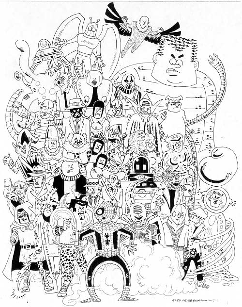 I’ve been a big fan of Fred’s work for years now–those HEMBECK collections, published primarily by FantaCo, exposed me to all sorts of characters and comics from the dim past of the 1960s that I’d never encountered before, albeit all filtered through Fred’s particular vision. And beyond that, there was something about his viewpoint that I liked. I could certainly relate to his background, also being a comic book reader growing up on Long Island in New York. One of Fred’s favorite runs is the early AMAZING SPIDER-MAN as drawn by Steve Ditko, and this piece seems to be almost something of a take on a pin-up Ditko had done showcasing pretty much his entire cast up till that time. (I’ve included the Hembeck recreation of that pin-up to the left as well.)