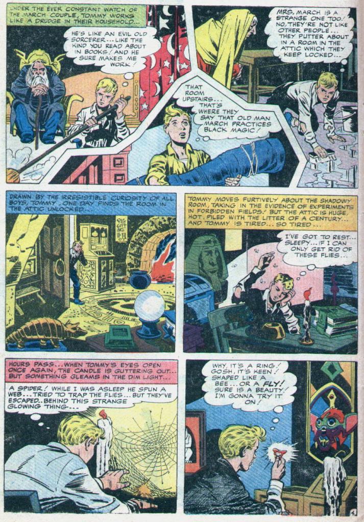 Regardless, the strip was slated to run in AMAZING ADULT FANTASY and the decision was made to have Steve Ditko ink the strip. And that’s where the trouble first started, it seems–because when he received the first batch of pages for the job (representing five penciled pages, apparently–no idea whether they had been scripted and lettered, though if they had been given to Ditko to ink then they almost certainly would have been) Ditko recognized how close to THE FLY this new series was veering.