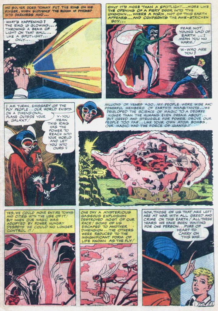 The other book they produced, however, was the Silver Spider. Except that, in the years that had come since, the monster movie THE FLY had been a runaway hit at the box office. Wanting to disguise the provenance of the character, knowing that John Goldwater would blow his top if he found out that Simon was peddling Harvey Comics rejects to him, he and Kirby reworked the original story–turning the genie into the otherdimensional fly alien Turan, and Tommy Troy’s costumed alter ego into The Fly.