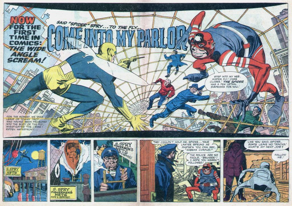 The story was the same, but the script was different. Additionally, the Fly incorporated a number of insect-based gimmicks into his arsenal, including the ability to walk up walls, the power of flight, a sting-like “buzz gun” and the ability to see in all directions at once. He was also vulnerable to direct bright light, which made him lose his equilibrium. But like Captain Marvel, he was still a kid who transformed into an adult super hero. Simon and Kirby instead made a spider the Fly’s first major villain, Spider Spry
