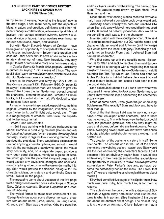 As is typical in these instances, I think the actual answer amounts to: Jack was definitely involved, and Spider-Man would not have existed without his involvement. But I also think the version of the character that was published owed relatively little to his conception and what he put forward–even though it was ultimately derived from those ideas.