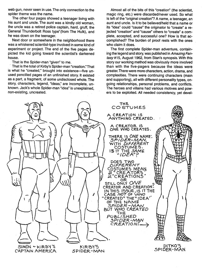 Ditko did say he didn’t know what Lee/Kirby discussed prior the synopsis that Lee provided…only that it discarded all the elements he’d seen before that made the strip reminiscent of the Fly. He then went to note that if Kirby could claim that Thor was ‘his’ creation (despite being based on the mythological Thor) then it was equally valid for Ditko to state that the Lee/Ditko Spider-Man was ‘their’ creation (even if there was a link to unused Simon and/or KIrby ideas) since in both cases the final version that actually appeared in print as a realised feature was new in itself.