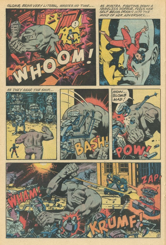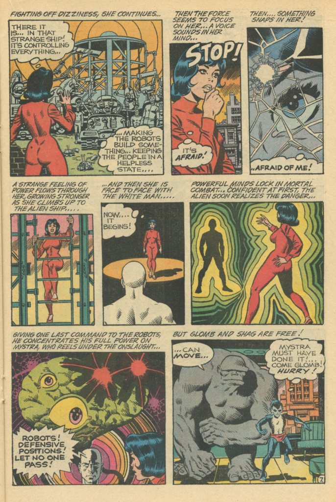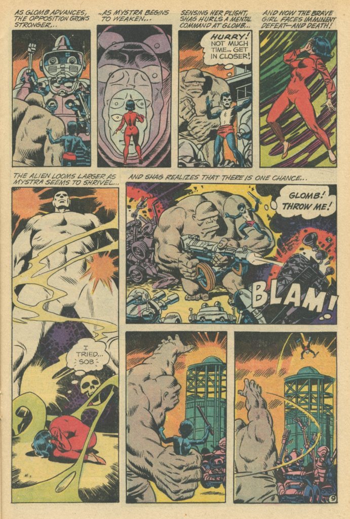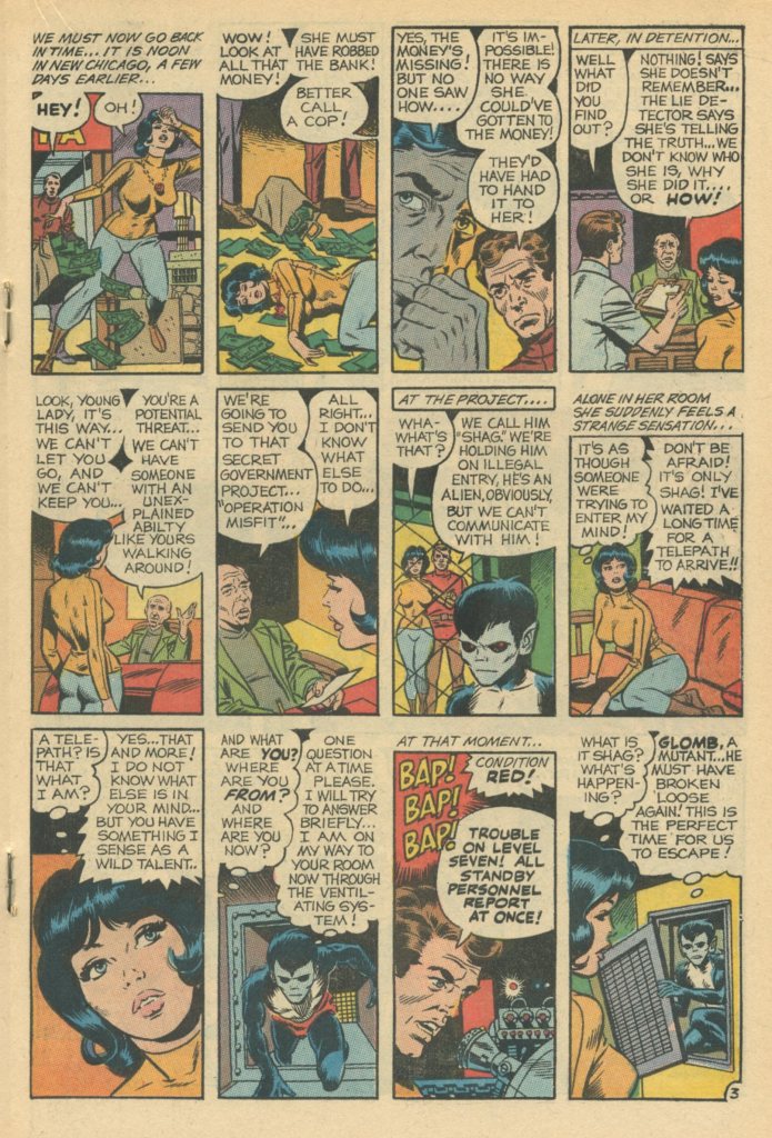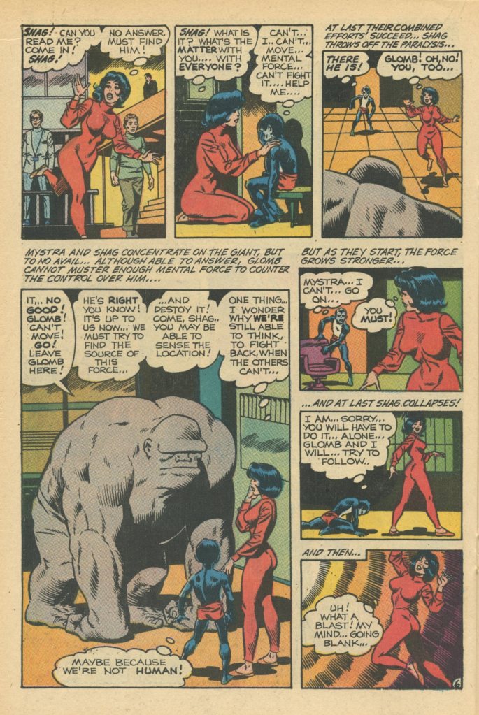 The Misfits are Shag, a small furry being who is the last survivor of a crashed space ship from another world, Mystra, who was an artificial android being with telepathic abilities, and Glomb, a huge and slow mutant who had been an attempt to genetically engineer a life form that could live on Jupiter among its heavier gravity. This trio of characters was a combination that Wood would return to again and again in his sketching–there was something about the child-man, the nubile woman and the huge, neckless rock moster that intrigued him.