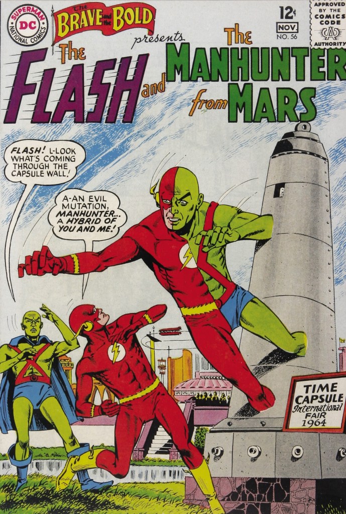 The story is as daffy and entertaining as you would expect. At this time, BRAVE AND THE BOLD was being run as a team-up comic in which two diverse super-stars from the DC line would join forces in a one-off adventure. This time out, as mentioned earlier, the two headliners in question were the Flash and the Martian Manhunter, fellow members of the Justice League. They’re both attending the International Fair of 1964 (a DCU stand-in for the actual World’s Fair which was held that year) in their civilian identities. Also interested in the fair is the Queen of the distant planet Argon, Queen Tatania. Her scientists have made an extensive study of Earth’s super heroes, and they believe they can now manufacture artificial hybrids with the combined powers of any two of them. But their first attempt to create such an android goes awry and runs wild, and so they exile it to Earth–it gets mistaken on the fairgrounds for a time capsule and is scheduled to be buried.
