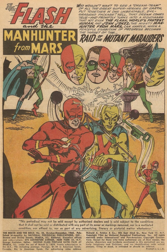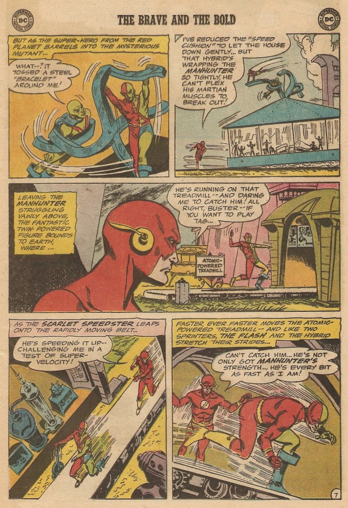 So the appeal of this issue of BRAVE AND THE BOLD was that it was clearly a vintage issue–the cover image itself revealed that it had been released in 1964. And it featured the Flash, still my favorite super hero despite my recent explorations of the Marvel characters. Plus, there was something compelling about that half-Flash/half-J’onn J’ozz giant that was threatening them. I also don’t remember what it cost, but I’m betting it was around $3.00, and that it was cheaper than any contemporaneous issues of FLASH that Bush had in stock that day. BRAVE AND THE BOLD wasn’t a title held in especially high regard by collectors at that time. As with the new issues I was reading, the uncredited story in this issue was written by Bob Haney, and it was illustrated by Bernard Baily, a longtime DC artist who had helped to originate the Specter with Jerry Siegel. Baily wasn’t doing a whole lot of work for DC by 1964, but I liked what I saw here, even though his figures were occasionally a bit stiff and awkward.