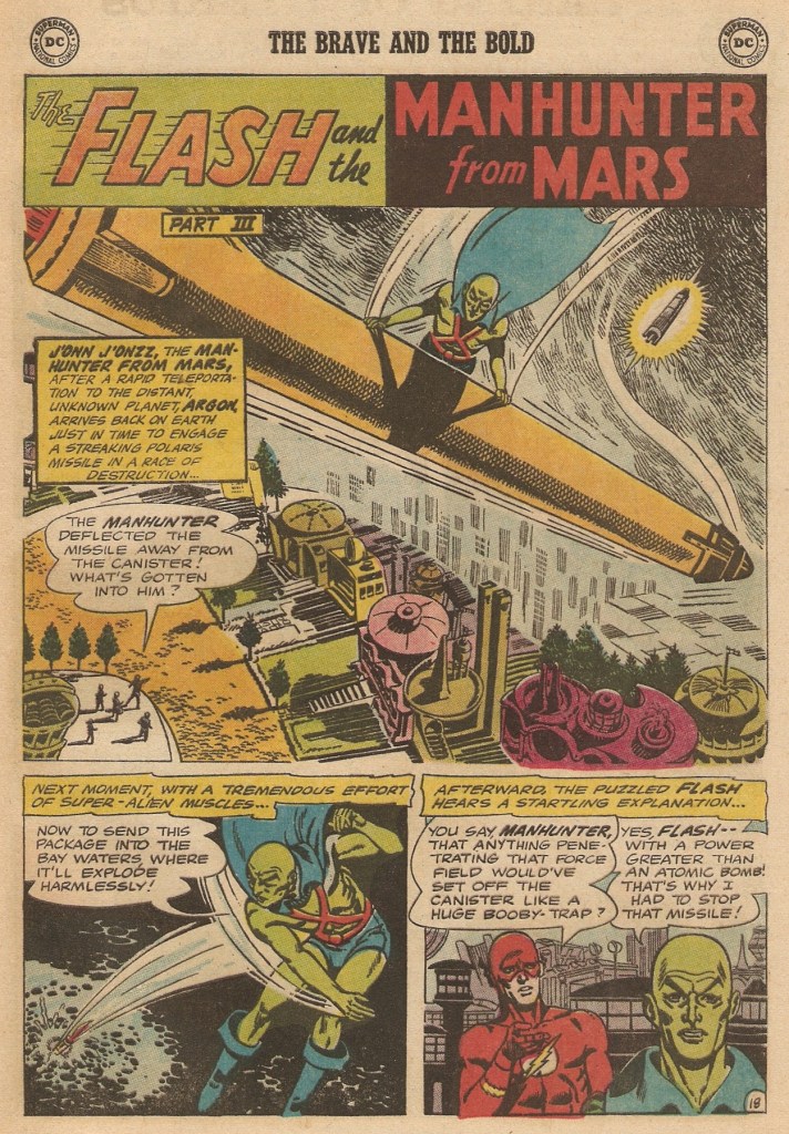 Eventually, the trail leads back tot eh time capsule, and J’onn’s Martian vision sees the creature they’re after inside the capsule, along with the remains of the female robot. He also recognizes the construction of the capsule to be Argon in origin, so he uses Dr. Erdel’s robot brain to teleport himself to that far-off planet for some reconnoitering. Meanwhile, the capsule breaks free from the temporary containment that Flash and J’onn were able to put it in and it hovers in the air. Believing it to be a clear and present danger, Flash urges the commander of a nearby submarine to fire a Polaris missile at the cannister, to destroy it once and for all. But before the missile can strike, the Martian Manhunter diverts it. He reveals that, had it hit, the resulting detonation of the capsule would have been greater than an atomic explosion. Oops, bad plan, Flash!