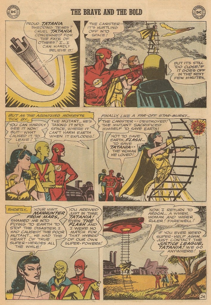 Rejected and broken-hearted for a second time, the Hybrid returns to the capsule, intending to detonate it and kill himself and the Earth. But before he can act, the real Tatania shows up, first to order the hybrid back to Argon and when that fails, to apologize for her harsh treatment of it. By this point, though, the final countdown is nearing its end, so the hybrid sends the capsule hurtling up into the air and out of Earth’s atmosphere so as to save the woman he loves–and the Earth additionally. The hybrid perishes, but Tatania returns to Argon a wiser and more sensitive ruler. And that’s all she wrote for this team-up of the Flash and the Martian Manhunter.