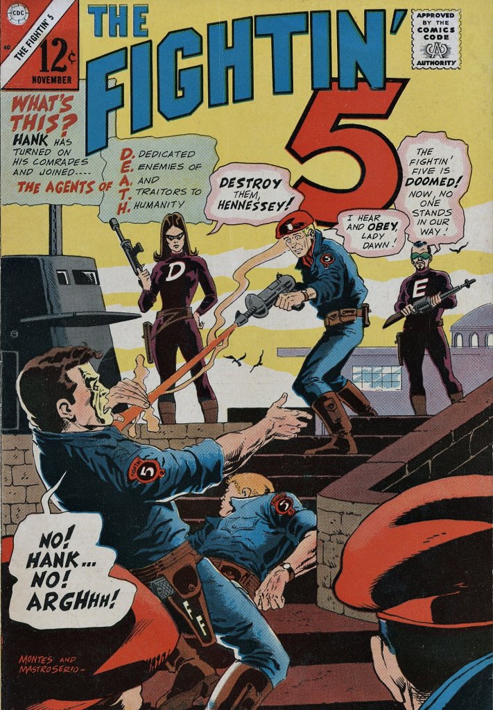 Here’s a great example of the fact that you never know what’s going to become a successful property over time. This issue of Charlton’s FIGHTIN’ 5 comic–a series that featured the adventures of a group of Blackhawk-like non-powered adventurers–also showcased, unheralded, the first appearance of a character who remained a footnote in comic book history for decades, but one who is now poised to become well-known on the international stage through the twin mediums of film and television. I’m speaking of the Peacemaker.