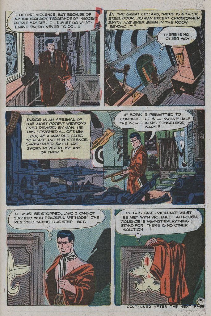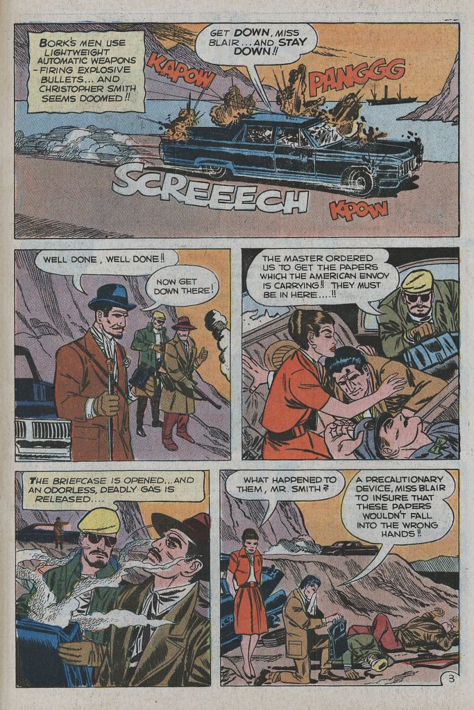 The Peacemaker was a weird concept for a series, especially in the mid-1960s. it was the brainchild of prolific Charlton writer Joe Gill and artist Pat Boyette. The Peacemaker was an American envoy, a man who loved and cherished peace and non-violence, and strove in his day job to make it a reality. But when war or violence broke out, he would gear up in a high-tech suit brimming with futuristic weapons and give it back to the aggressors. There wasn’t any Jekyll/Hyde thing going on here–Christopher Smith wasn’t crazy (although later DC revivals from the 1980s would choose to play him that way.) He was quite simply a hypocrite for peace. As the tag line said: “A Man Who Loves Peace Enough To Fight For It!”