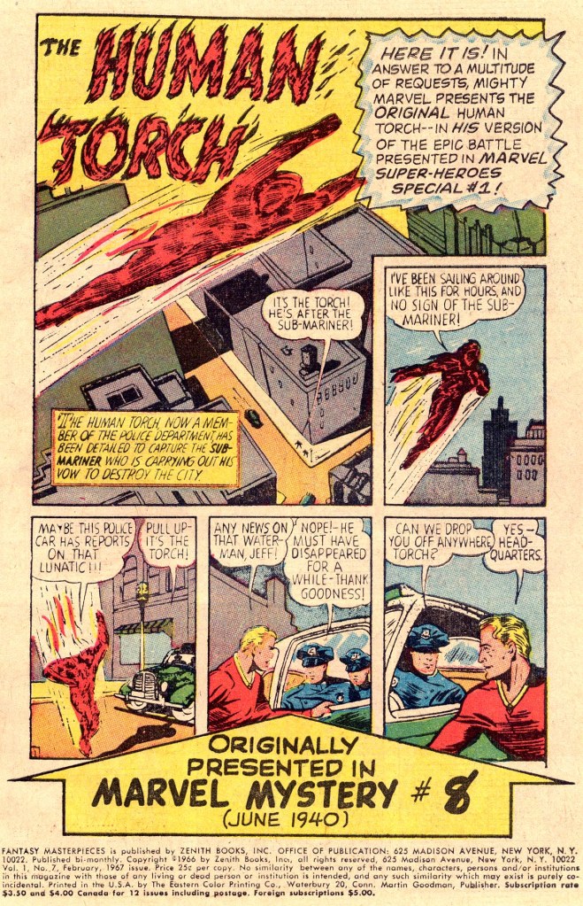 Marvel had previously reprinted a golden age Sub-Mariner story in MARVEL SUPER-HEROES #1, a one-shot special. The story they’d chosen had a cameo from the Human Torch at the end of it–he had been following Namor’s trail of destruction across the city, and eventually caught up to him and forced him to withdraw back to the ocean. But that was only half of the story. This was the other half, a Human Torch tale written and drawn by his creator Carl Burgos in which the Torch, now a member of the NYPD, chases after Namor and is forced to contend with the carnage that he’s left in his wake. As in the parallel story, the Torch does eventually catch up to the Sub-Mariner and drive him back beneath the waves–but especially exciting to me was the final blurb on the story, which indicated that the next issue of FANTASY MASTERPIECES would be reprinting the full-length battle between the two–a battle I had read about and glimpsed in the STERANKO HISTORY OF COMICS. So FANTASY MASTERPIECES #8 immediately went onto my want list.