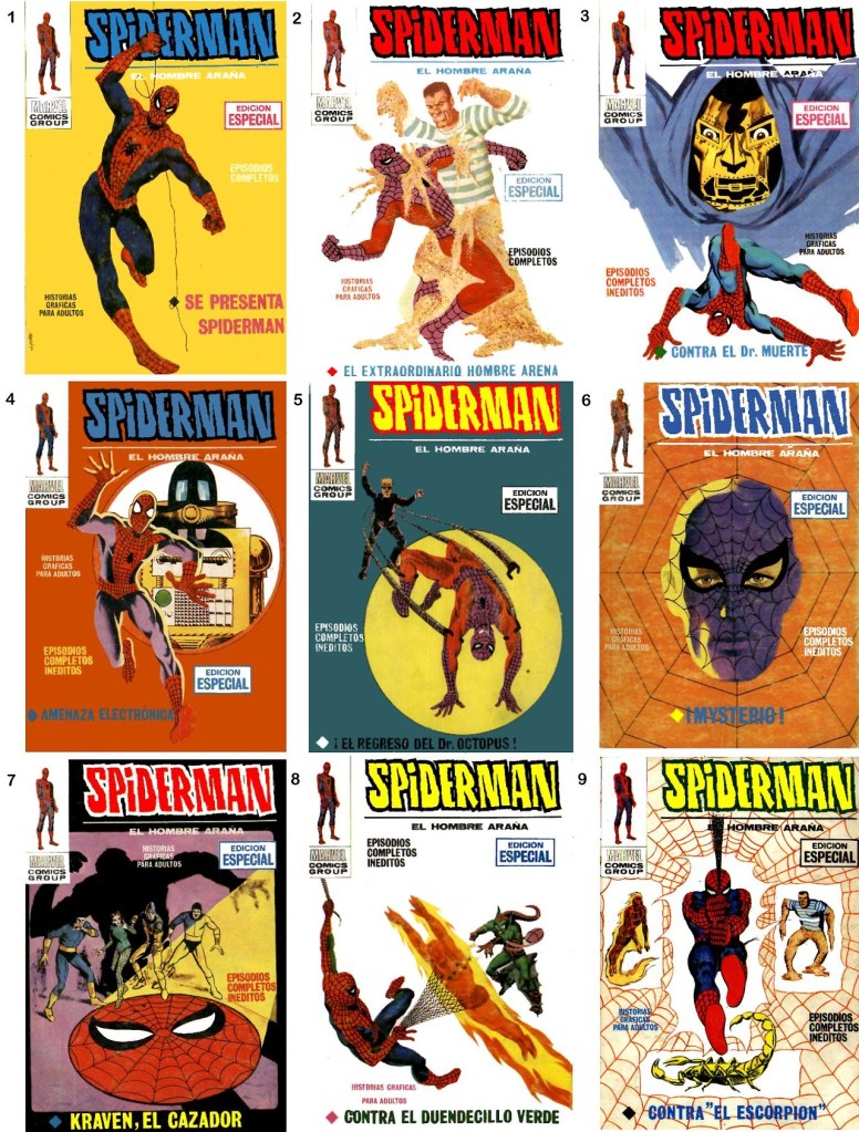 Here’s a string of early Spider-Man issues reprinted in Spain in the very late 1960s with new covers, mostly based on either the American cover or else assorted interior art.