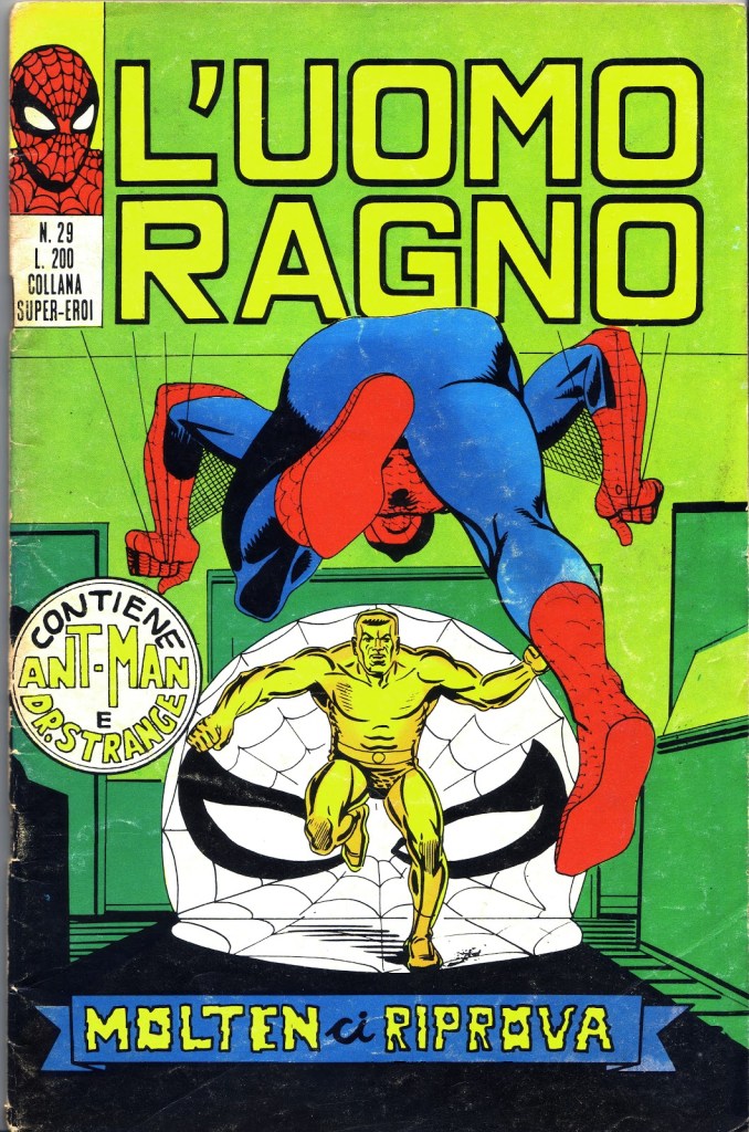 This Italian Spider-Man cover gained some notoriety and interest as it used the artwork to the cover of AMAZING SPIDER_MAN #35 the way Steve Ditko originally drew it, before editor Stan Lee had the Spider-Man figure redone by Jack Kirby.