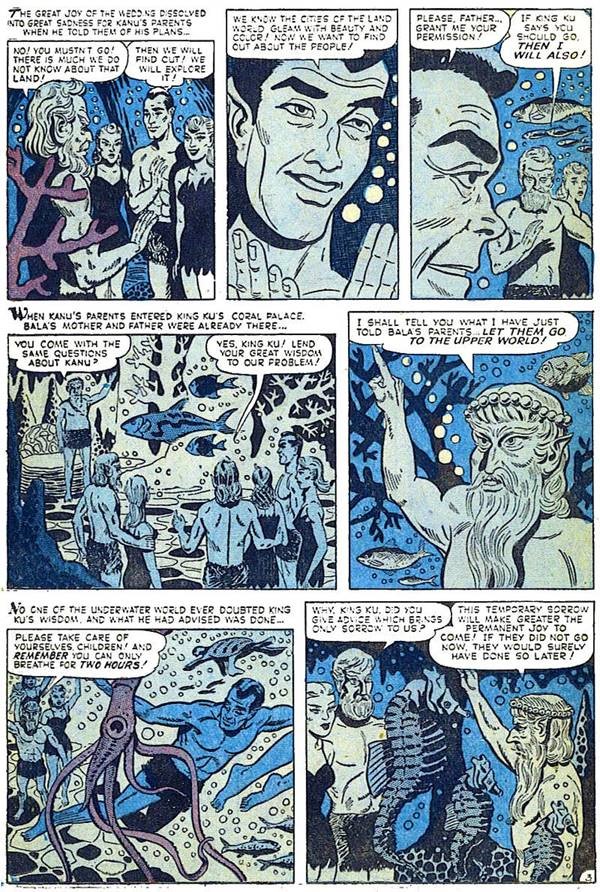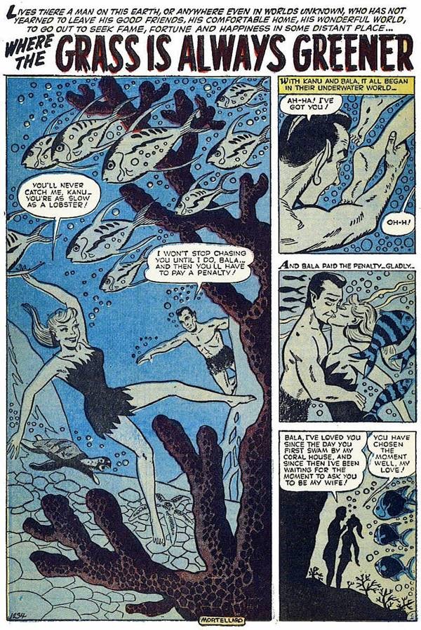Here’s a weird little throwback adventure, one that some have theorized might have represented an earlier unpublished Sub-Mariner adventure being burned off, but that I think simply amounts to something of an inside joke. In this 1956 premiere issue of ADVENTURE INTO MYSTERY, there’s a short 4-page story drawn by Tony Mortellaro about an undersea couple who tries to live on the surface world but things don’t work out. And the lead character, Kanu, is a dead ringer for Namor. Ironically, Bill Everett, the Sub-Mariner’s creator, drew the cover for this issue.