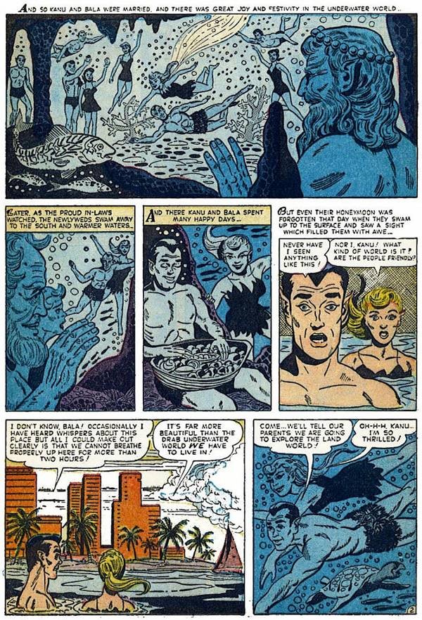 The story itself here was pretty clearly not commissioned as a Sub-Mariner adventure. There are just too many incongruous details to it, from the fact that the lead character is married to him not being familiar with the surface world. So i think the fact that Mortellaro chose to draw him resembling Prince Namor was a bit of humor on his part. The SUB-MARINER revival comic of the 1950s had only ended a year or so before.
