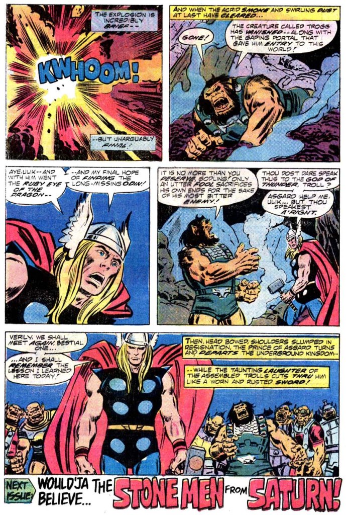 But Trogg proves to be much more formidable than Thor had anticipated in his arrogance. He breaks free of the barricade almost as soon as the pair arrives, and all of their efforts to bring him to ground are futile. At the climax of the battle, Ulik has forced Trogg back into the aperture of the portal through which he appeared, but only by sacrificing the Ruby Eye can he be once again sealed within. Reluctantly, Thor gives up his prize, hurling it into the portal and thus sealing Trogg away forever. But now Odin’s whereabouts are lost to him–and to make a bad situation even worse, Ulik and his fellow Trolls laugh at the Thunder God for having given up his prize to rescue his enemies. So it’s an angry Thor who stomps off out of the story and into the following issue, where his quest for Odin would continue.