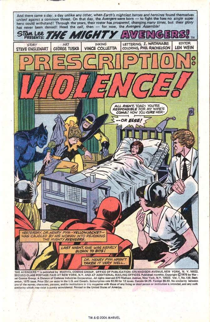 So what’s going on in the world of Earth’s Mightiest Heroes? Well, the Wasp lured her husband Yellowjacket back into teh fold during the group’s last roster shake-up–only for Jan to be felled by an explosion immediately thereafter in battle with the Stranger. The Avengers brought the Stranger to heel, only to learn that he wasn’t the true Strange at all–he was the Toad, Magneto’s flunky, who had once been imprisoned along with the Master of Magnetism on the Stranger’s planet and was able to purloin some equipment from it. But none of this does anything to help the injured Wasp, and so Yellowjacket is beginning to lose it. Matters are made worse with the arrival of old nemesis Whirlwind at the hospital. He’d always been obsessed with the Wasp, and here he sees his chance to make off with the injured Jan. The new Avengers manage to drive him off for the moment–in particular, Moondragon, against whose mental powers Whirlwind has no real defense. But as always, he disappears once again in plain sight, resuming his secret identity as “Charles”, the Wasp’s former chauffeur.