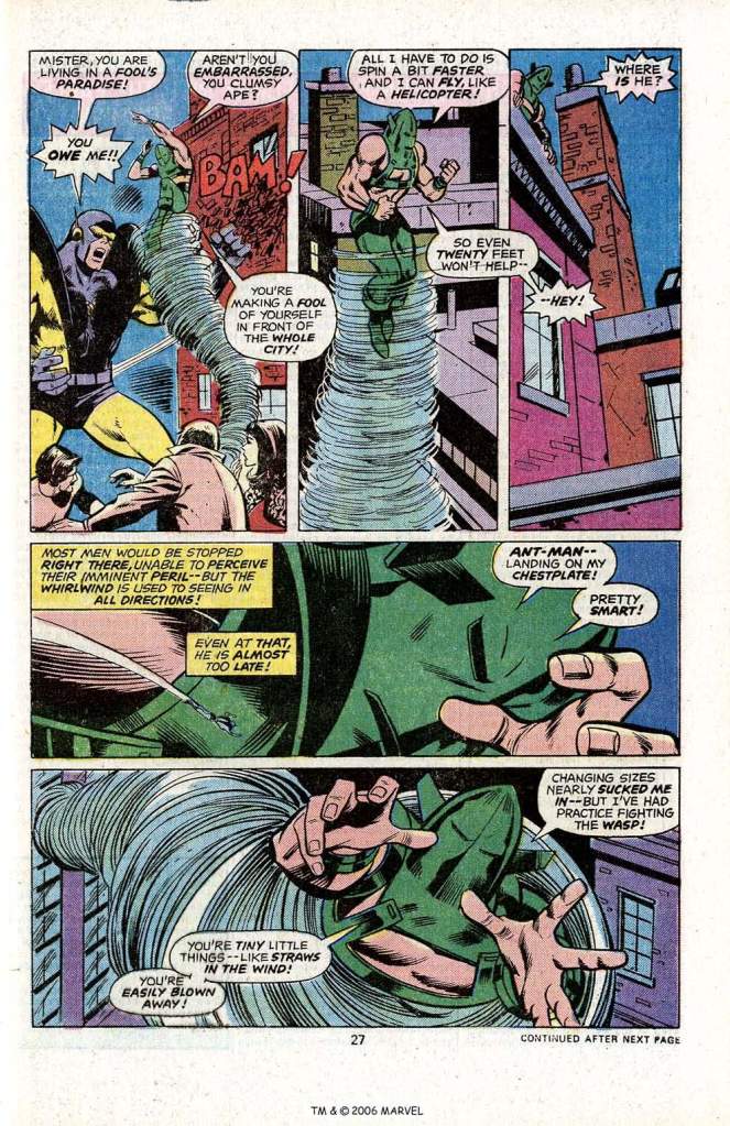 Foiled in his attempts to steal away the Wasp, Whirlwind follows Yellowjacket back to his residence and attacks him away from the other Avengers. But YJ is too quick for him, ironically enough–and when the Master of Many Sizes pulls his disruptor pistol on Whirlwind, the villain retreats rather than face it. Which is strange–Whirlwind has never faced this weapon before, should have no idea as to what it does. This leads Hank Pym to give the matter some thought, and he pierces the secret of Whirlwind’s true identity, turning the tables and ambushing the spinning psycho in his own limousine. But that’s not the same thing as vanquishing him, and Yellowjacket is fighting with a drawback: in recent stories, he’d been trapped at ant-size thanks to a microbe in his bloodstream. That microbe is still there, and so every time he makes a size-shift, he’s taking a chance that he might be stricken and perish.