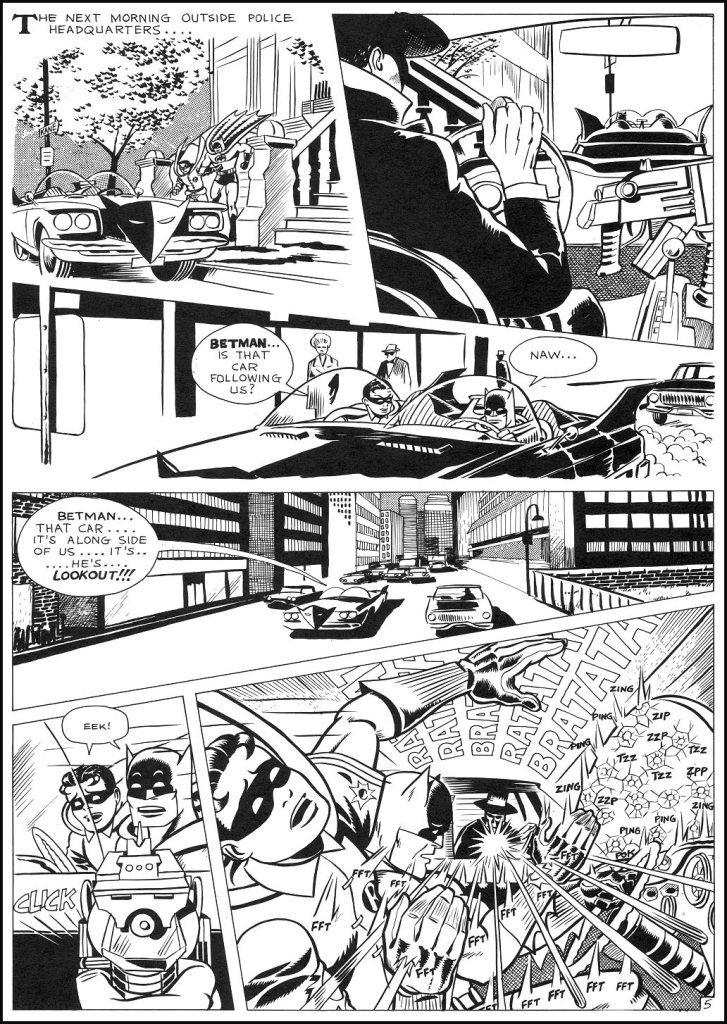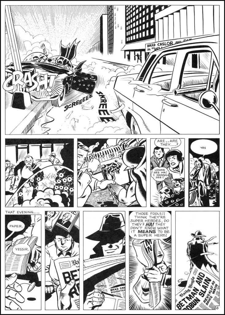 Here, we get a very classic Dick Sprang-style Batman and Robin (albeit in a later model Batmobile.) What’s interesting about Caslor’s approach is that he’s able to depict the individual characters in these different styles and “on model” with their comic book roots without all of them feeling like they’re living in different universes on the page. Everything integrates nicely.