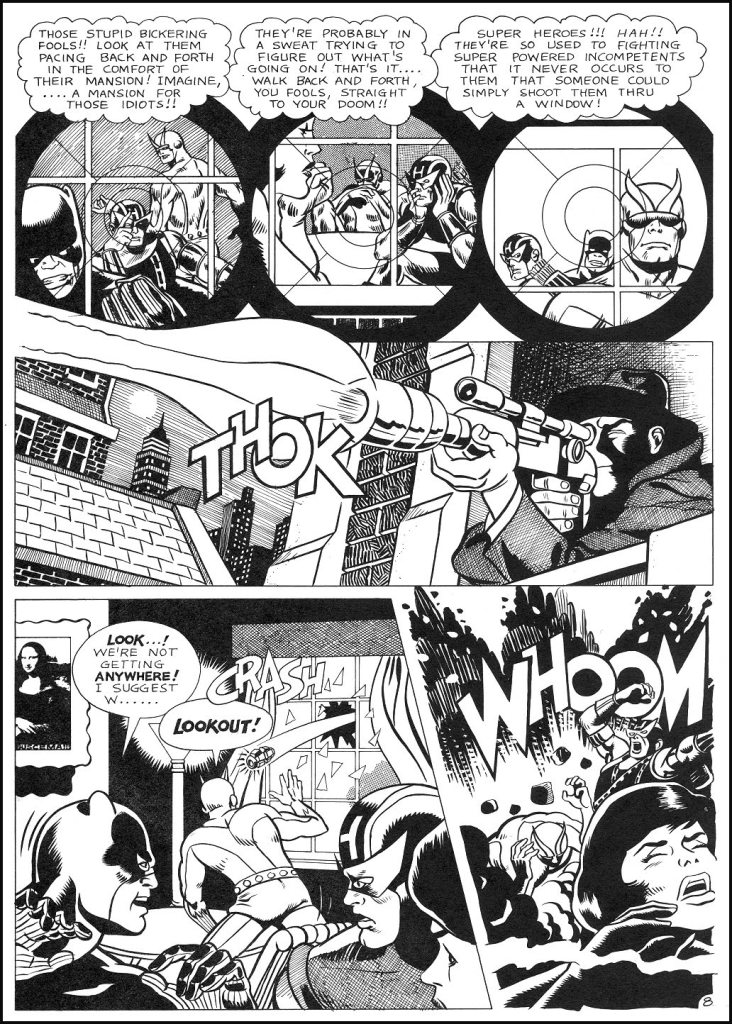 Here, it’s a very specific period of AVENGERS that Caslor is modeling things after, drawn by John Buscema and inked by George Klein. I wonder if that Mona Lisa painting in the background isn’t’ a comment on Buscema’s skill level as a draftsman.