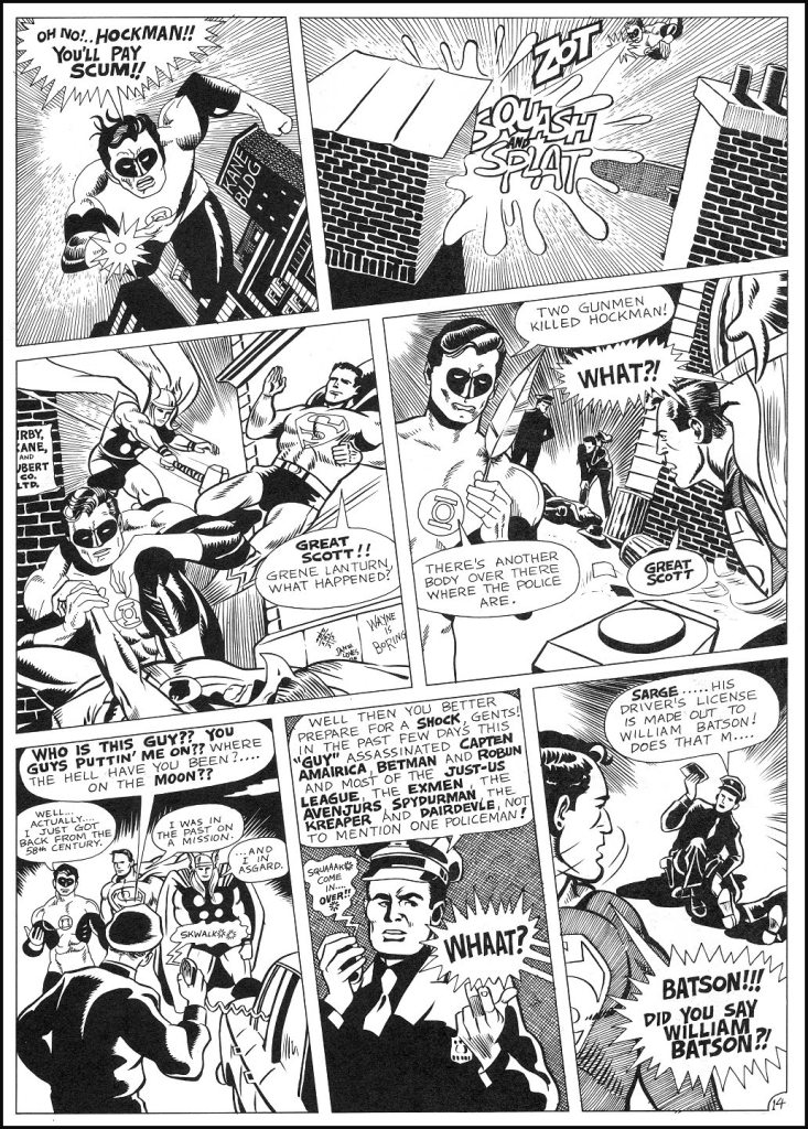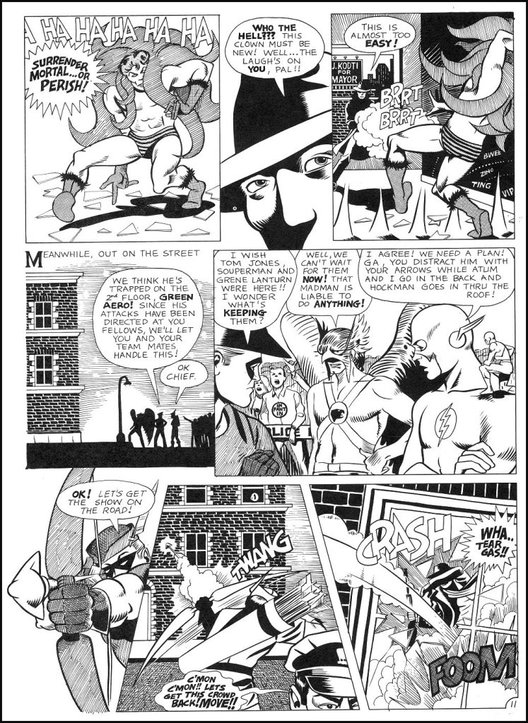 Here’s a Ditko-style Creeper, a Carmine Infantino-esque Flash and a Joe Kubert-styled Hawkman all on the same page.