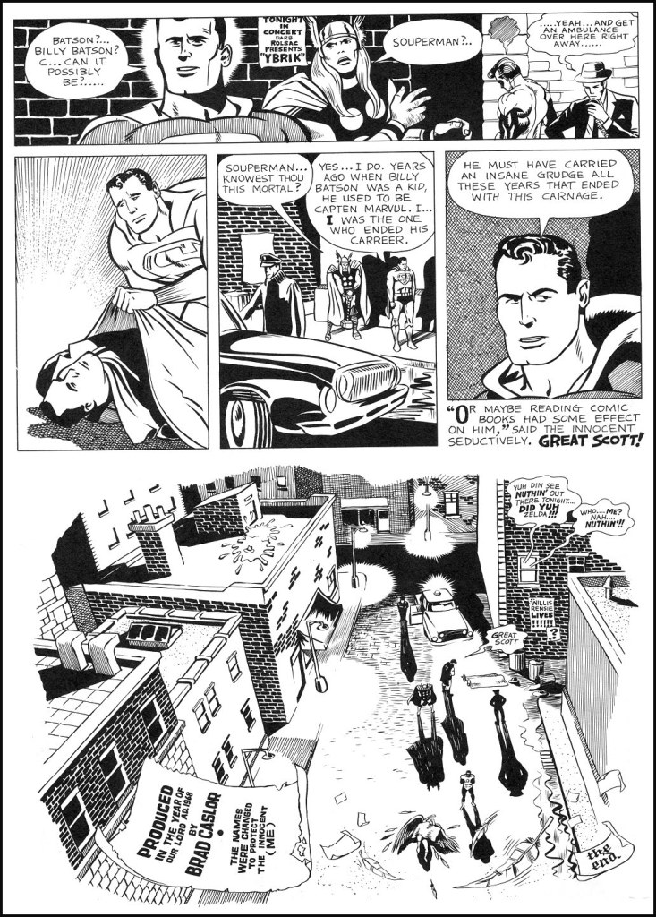 Here’s another forgotten, fannish collection, a story that was serialized across three issues of the long-running fanzine The ROCKET’S BLAST COMICOLLECTOR. It was produced by artist Brad Caslor, who would eventually go into animation as a storyboard artist and director. But here, he channels the individual styles of close to a dozen other creators to bring forth one of the earliest attempts at a Marvel/DC crossover (though all of the characters’ names have been sanitized slightly in an attempt at avoiding lawsuits. It saw print in 1971 in ROCKET’S BLAST COMICOLELCTOR #85-87, and was a bit of a sensation. It helps to remember that at this point, the very idea of there being actual sanctioned Marvel and DC crossovers was unheard of. So fannish stories such as this one were the only time anybody thought they’d ever get to see their assorted favorites together.