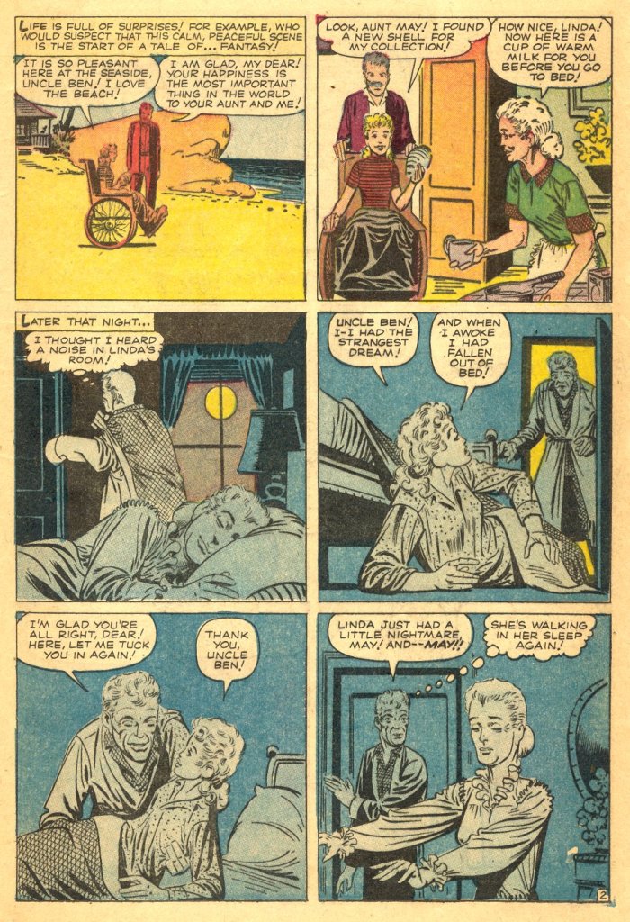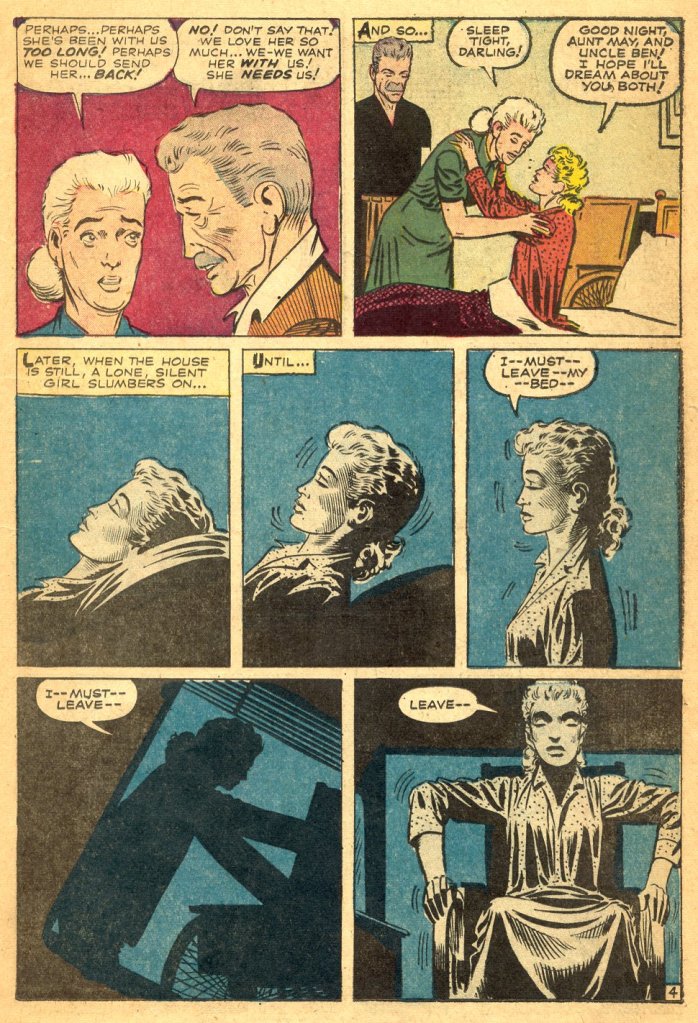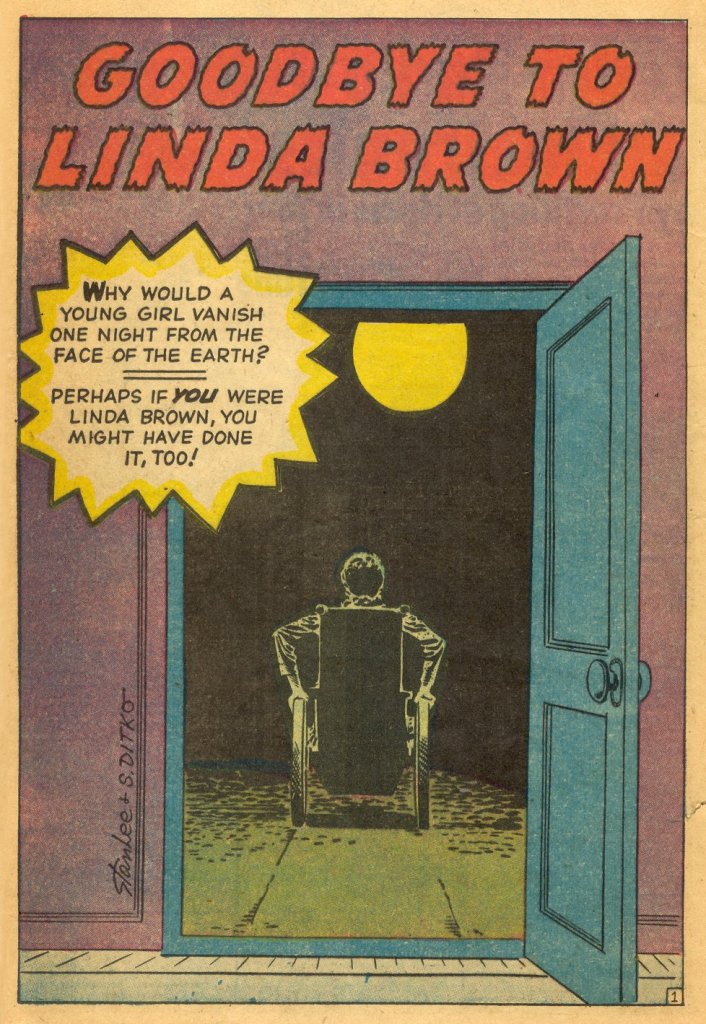 One of the more storied of these prototype adventures was this short 5-page suspense story produced by Stan Lee and Steve Ditko for STRANGE TALES #97. It’s perhaps noteworthy in that it carries a cover date of June 1963, just two months before the cover date on AMAZING FANTASY #15 in which Spider-Man made his debut. The story concerns a wheelchair-bound girl named Linda Brown, who lives with her guardians named Uncle Ben and Aunt May.