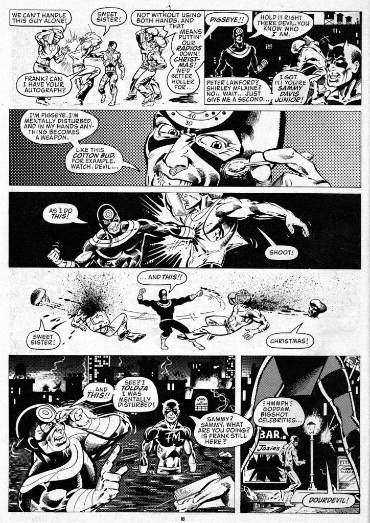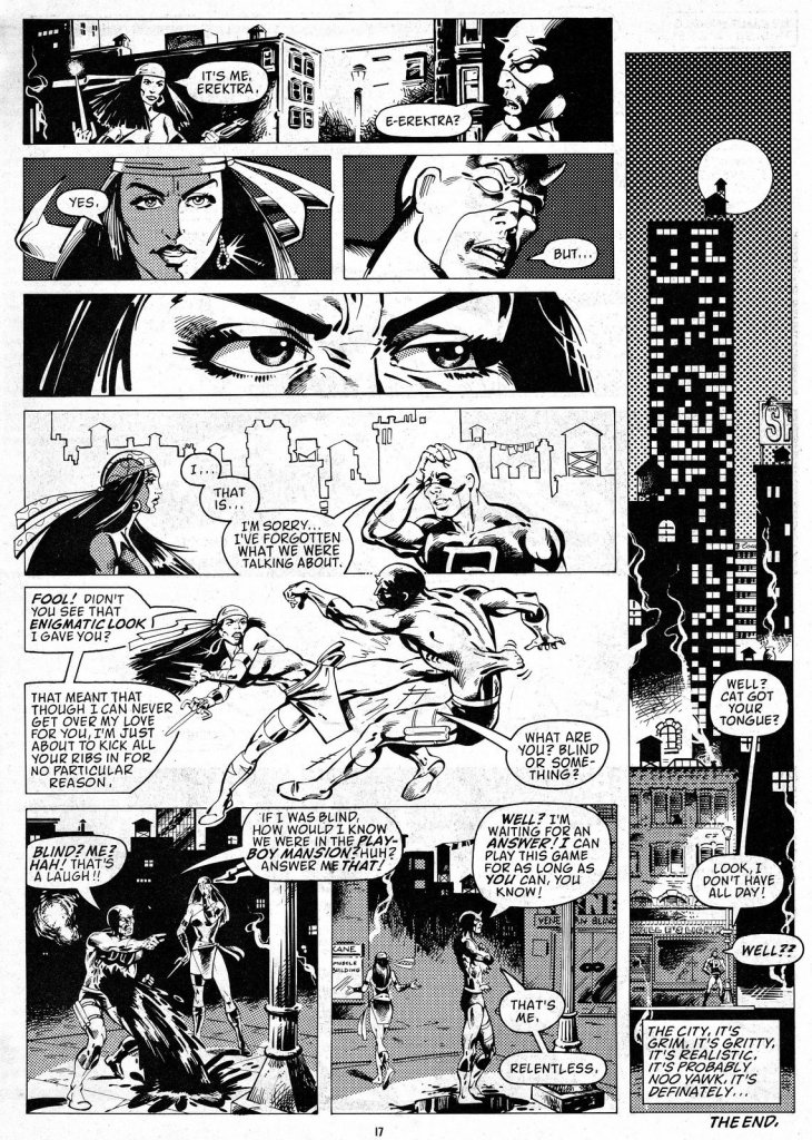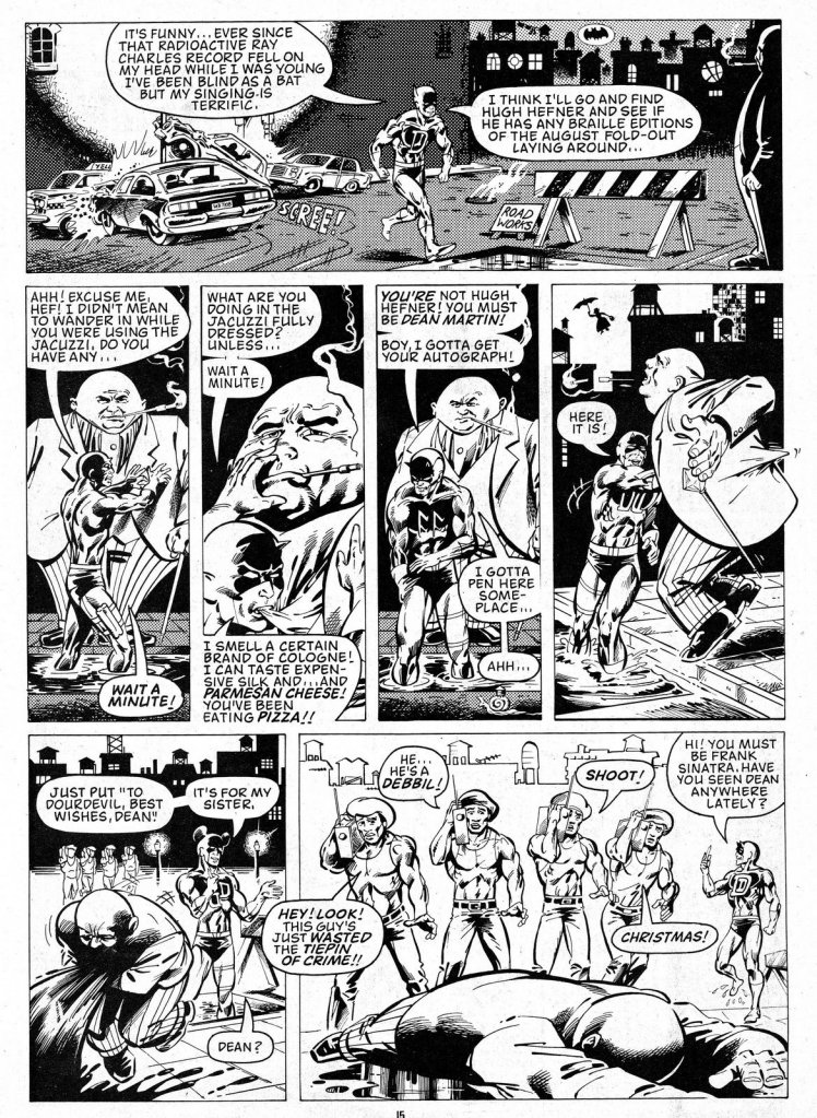 In this issue, Moore and artist Mike Collins produced a savage and on-point satire of the then-current DAREDEVIL series the magazine was reprinting. It’s worth mentioning that this story was produced in the midst of Miller’s run, and so while it takes many of its cues from Miller’s solo issues, it also skewers the earlier Roger McKenzie stories that were then filling pages elsewhere in the issue.