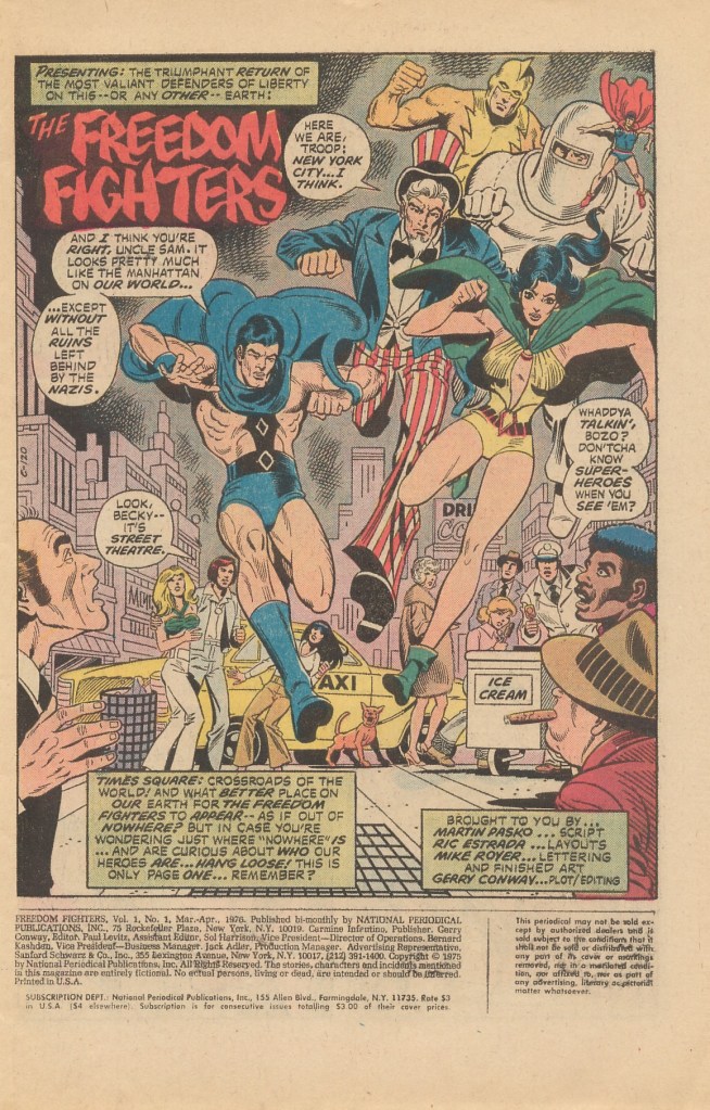 There was a lot of nostalgia in the 1970s, and this brought some fan interest back to the Quality heroes after years of being fallow. Quality’s output lived up to its name–they maintained a very high standard of quality in both story and art, so the line was well-remembered. So when Conway was looking for other titles he could launch, doing something with the Freedom Fighters seemed like a decent idea. They were good raw materials at any rate. Conway plotted this first story but couldn’t script it, so he handed over the dialogue to Marty Pasko. Ric Estrada did the page breakdowns, leaving it to inker/finisher Mike Royer, one of Jack Kirby’s best inkers, to handle the final artwork as well as the lettering.