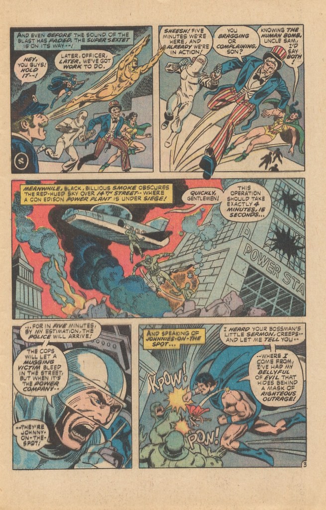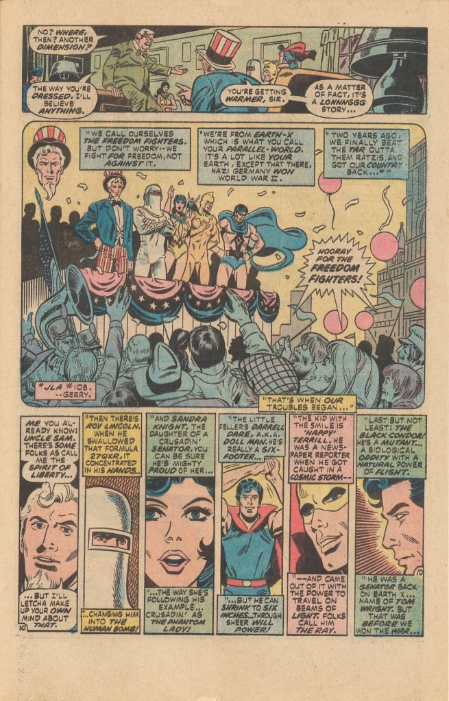 In the course of the fight, all six Freedom Fighters–Uncle Sam, Human Bomb, Phantom Lady, Doll Man, the Ray and the Black Condor get to show off what they can do–and Phantom Lady suddenly manifests the power to become unsolid, which we’ll eventually learn is somehow a byproduct of having traversed the dimensions. (Conway was looking to upgrade the powers of a few of the more ordinary Freedom Fighters with this approach–a couple of the other characters would manifest new powers further on in the run.) As was typical of the era, the Freedom Fighters are able to drive the Silver Ghost off but not capture him–and they find themselves brought before District Attorney David Pearson to explain themselves (and to give Conway/Pasko an opportunity to infodump a lot of the backstory I’ve already recapped.)